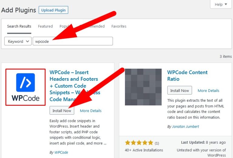 - On the next page, search for wpcode and you will find a plugin related to that.
